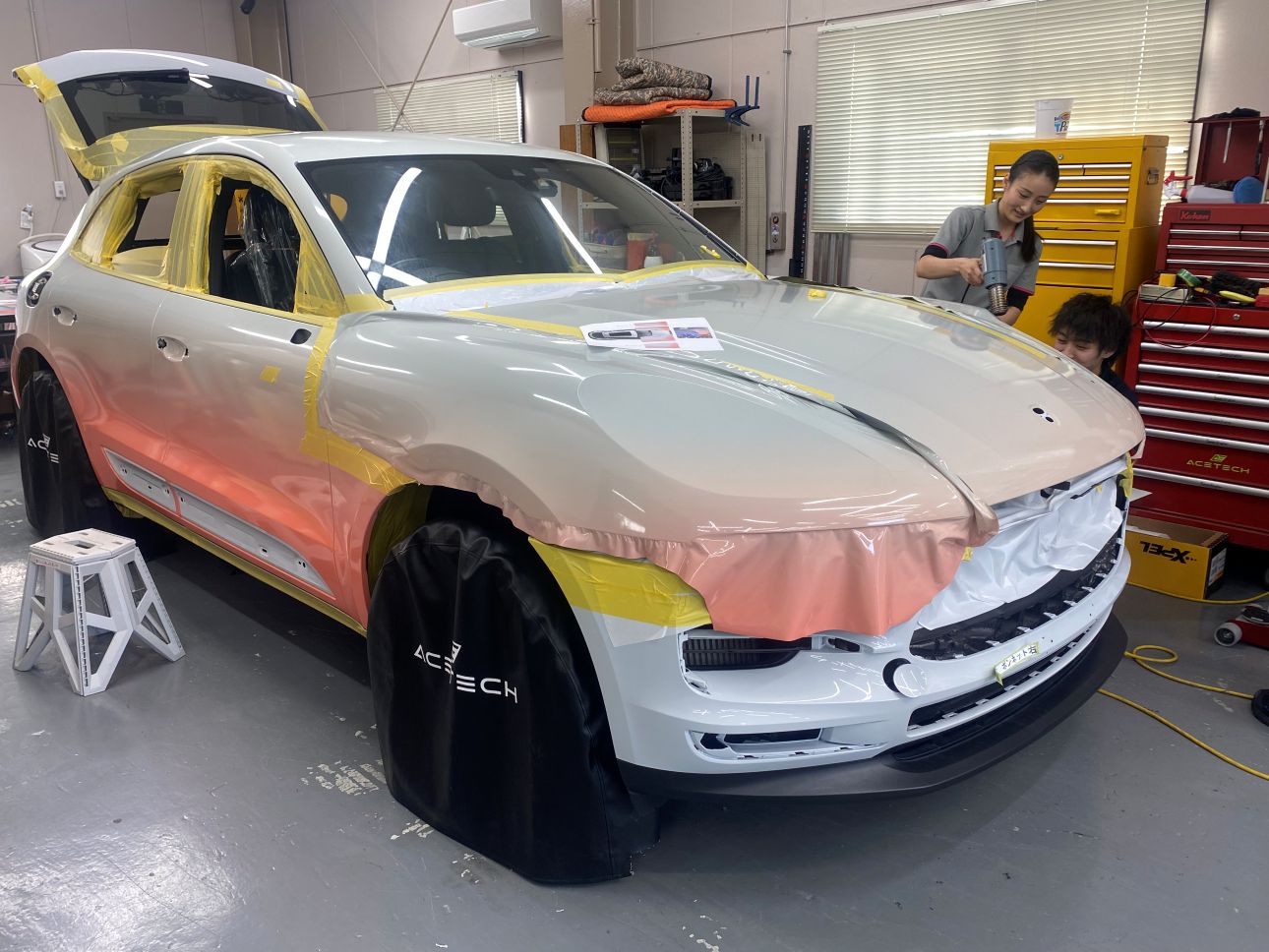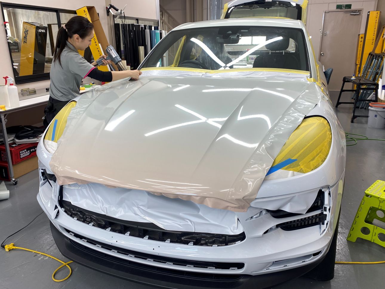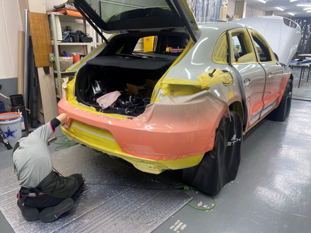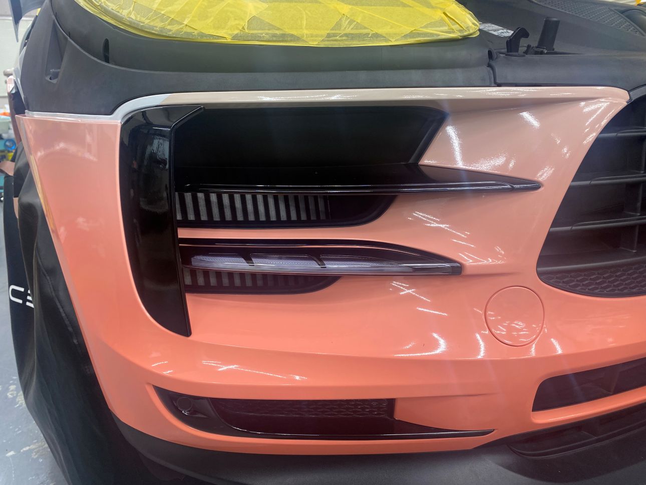 ボンネット先端のグラデーションに合わせて、バンパーは調整しながら施工