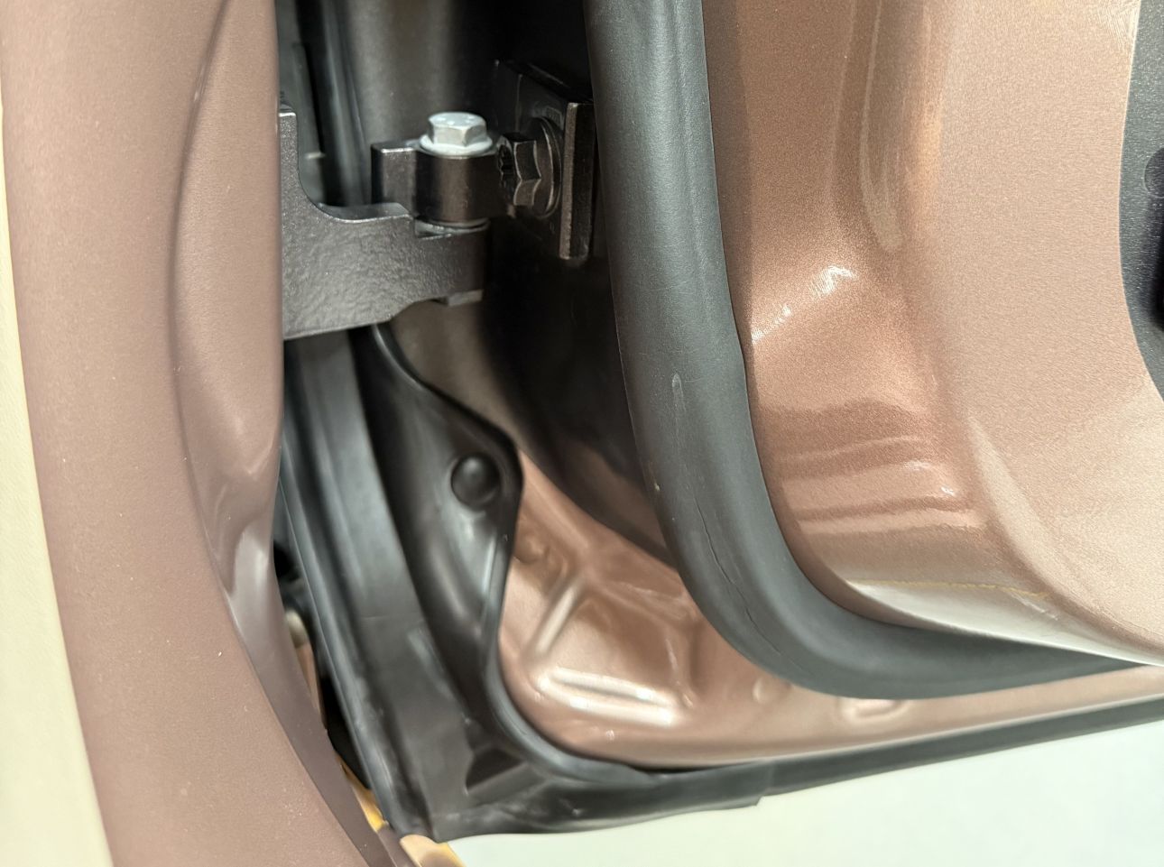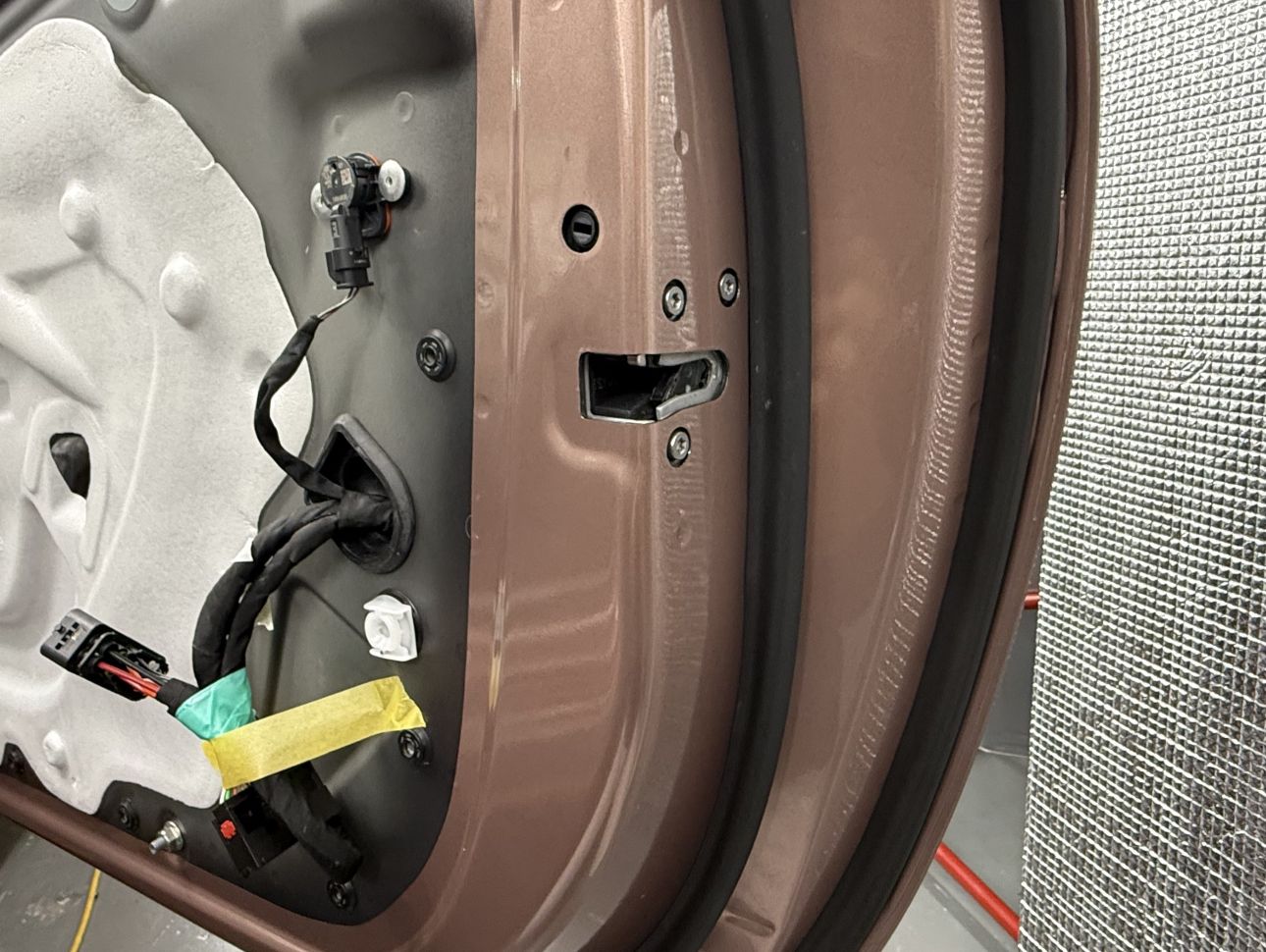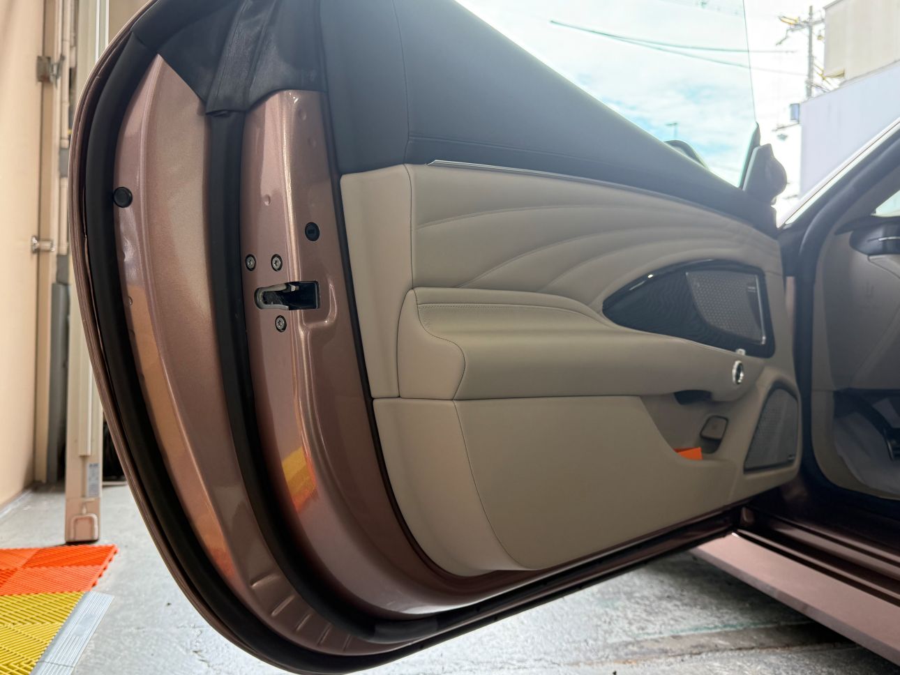 エーステックでは、ドア内側の施工する場合、ドアを外しての施工はしませんので手の入る範囲まで極力貼り込みます