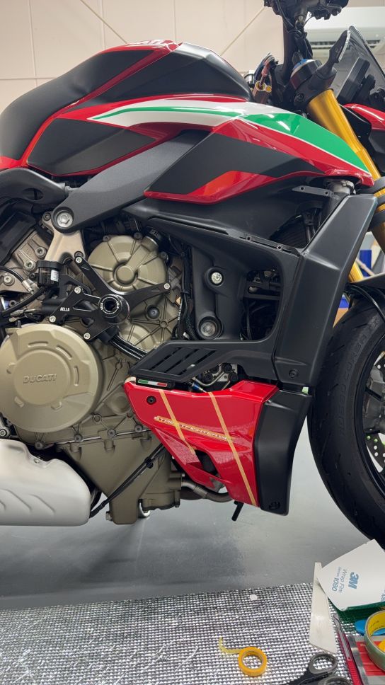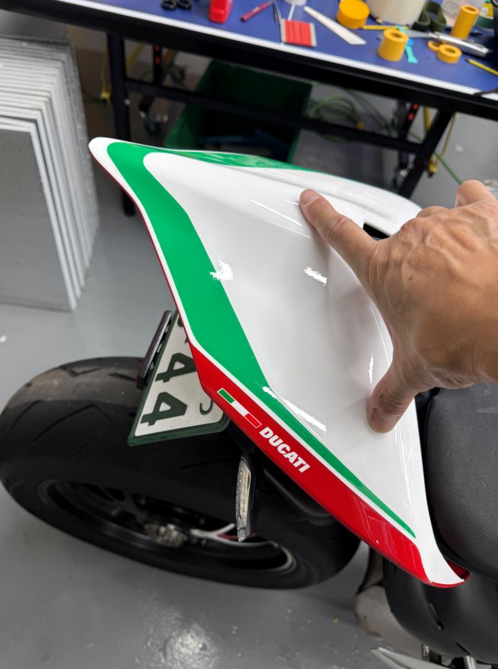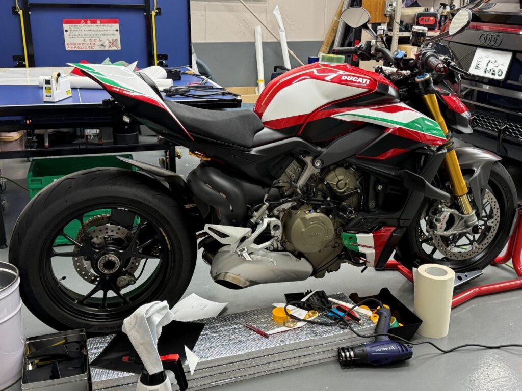 跨る時についつい蹴ってしまうテールカウルにもグロスのプロテクションフィルム施工