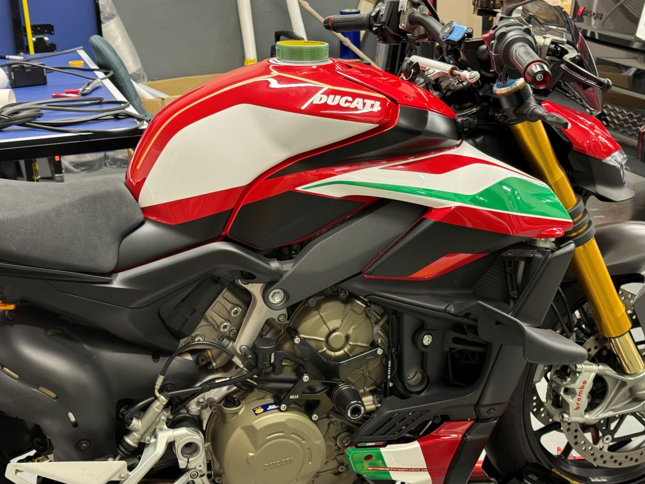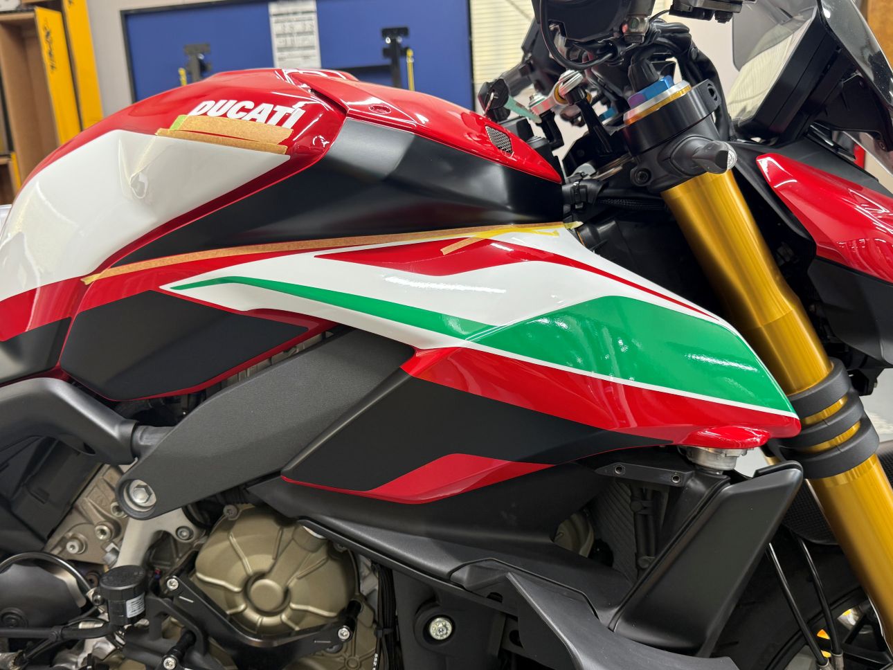 何度もマスキングテープでライン取りして、好みのラインを抽出して反映していきイタリアンバイクらしいデザインを構築していきます!