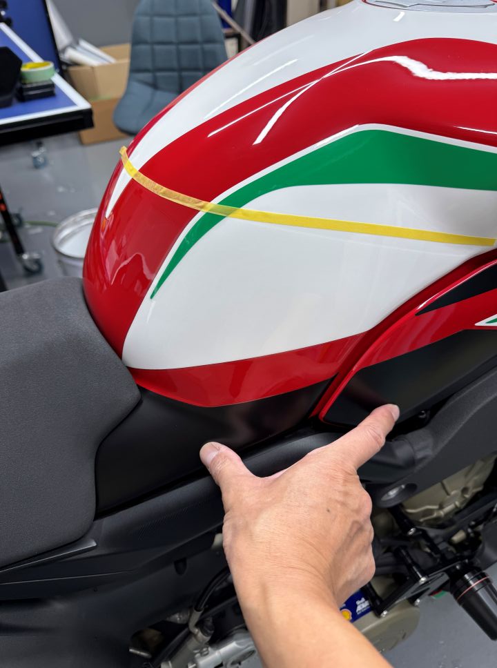 タンクのニーグリップする所は、グロス&マットのプロテクションフィルム施工