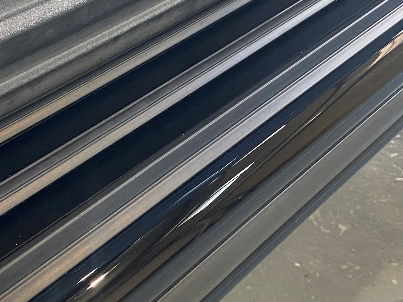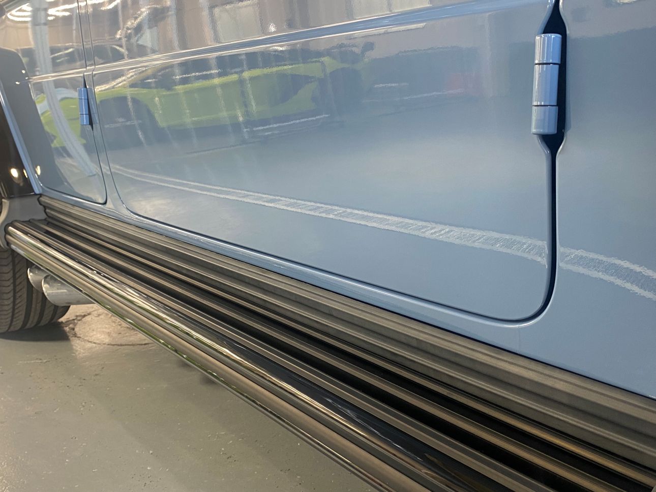 鏡面ステンレスのステップボードと背面タイヤカバーは、グロスブラックプロテクションフィルム施工で、ブラックに統一。