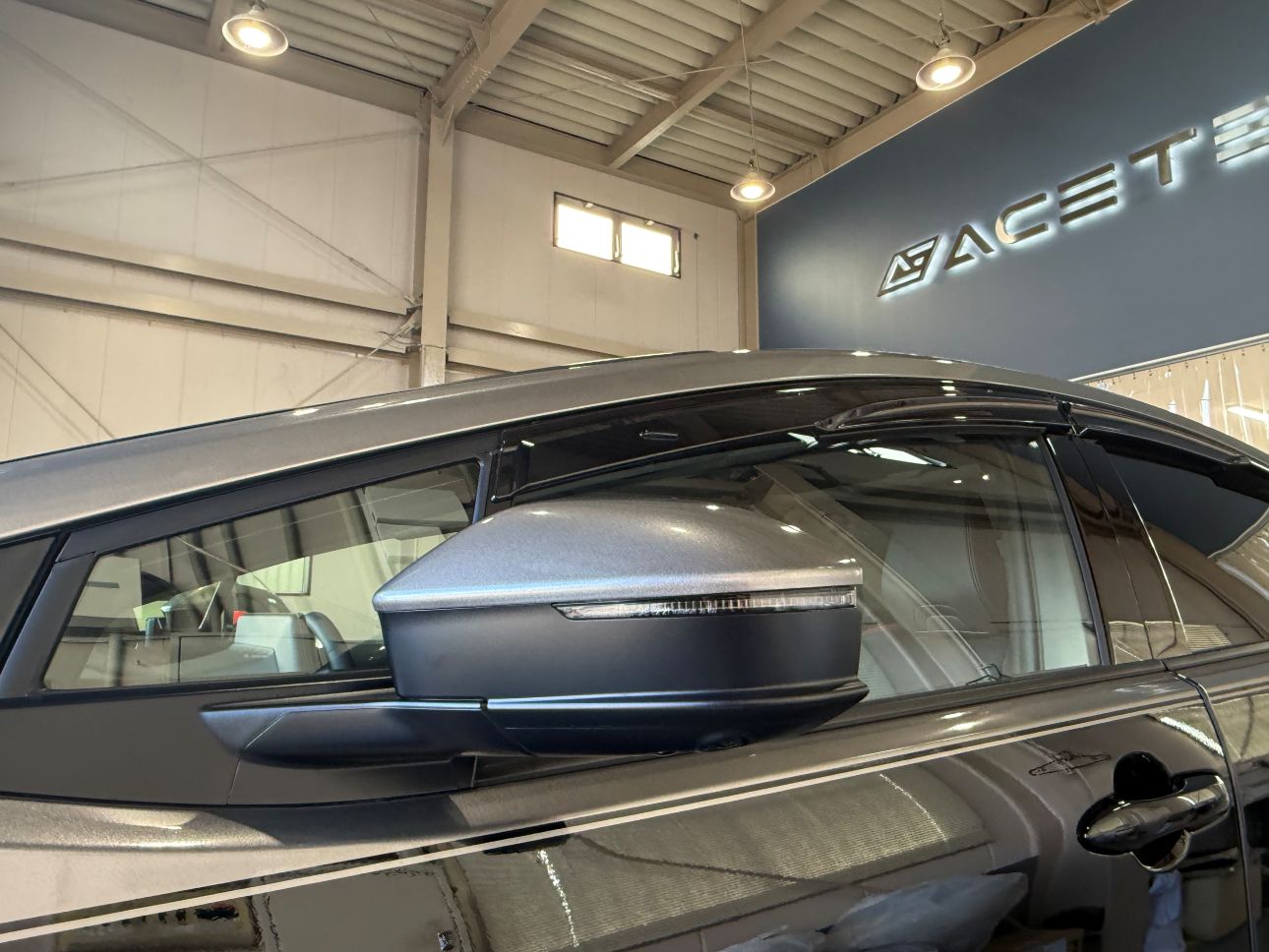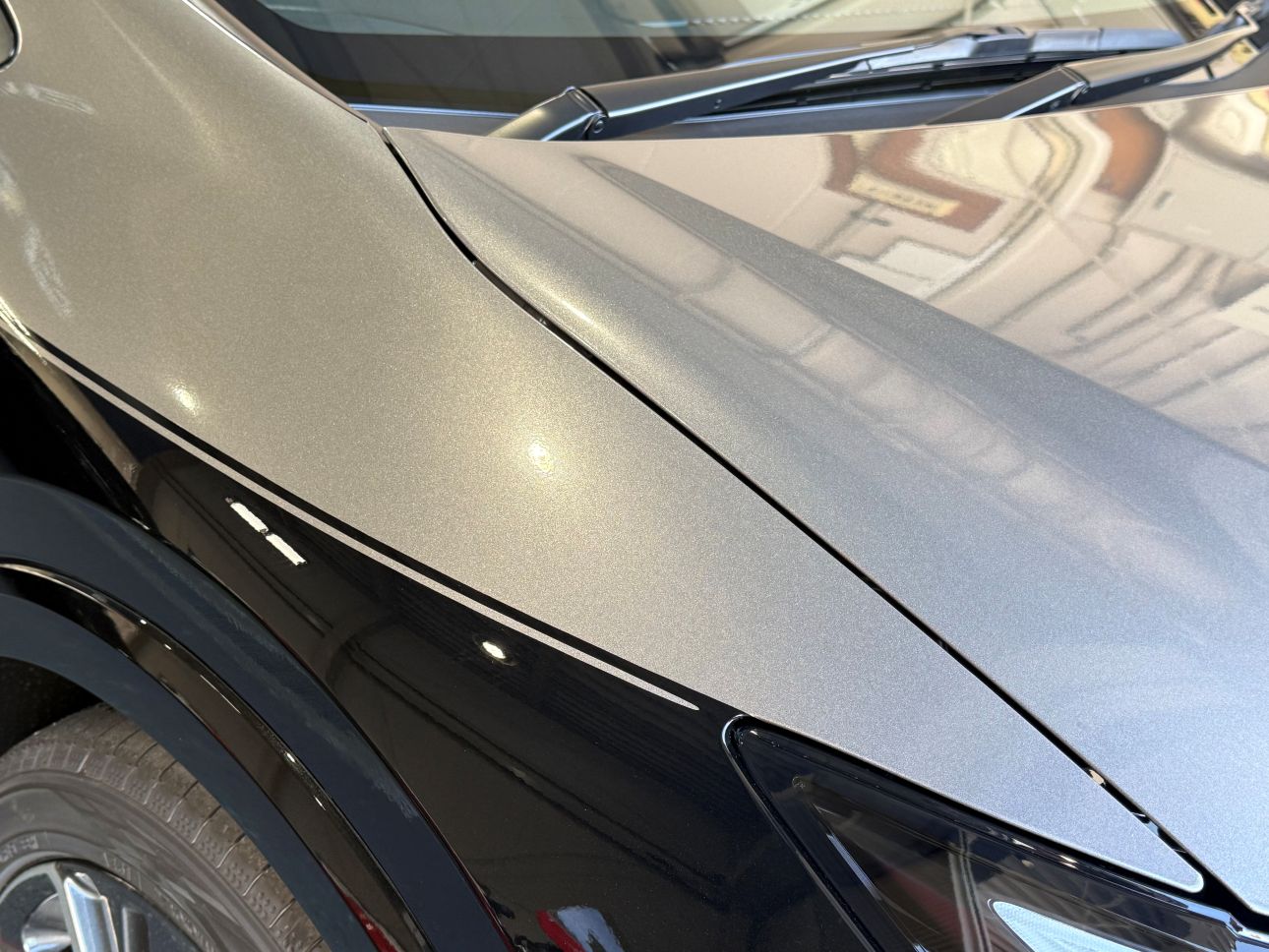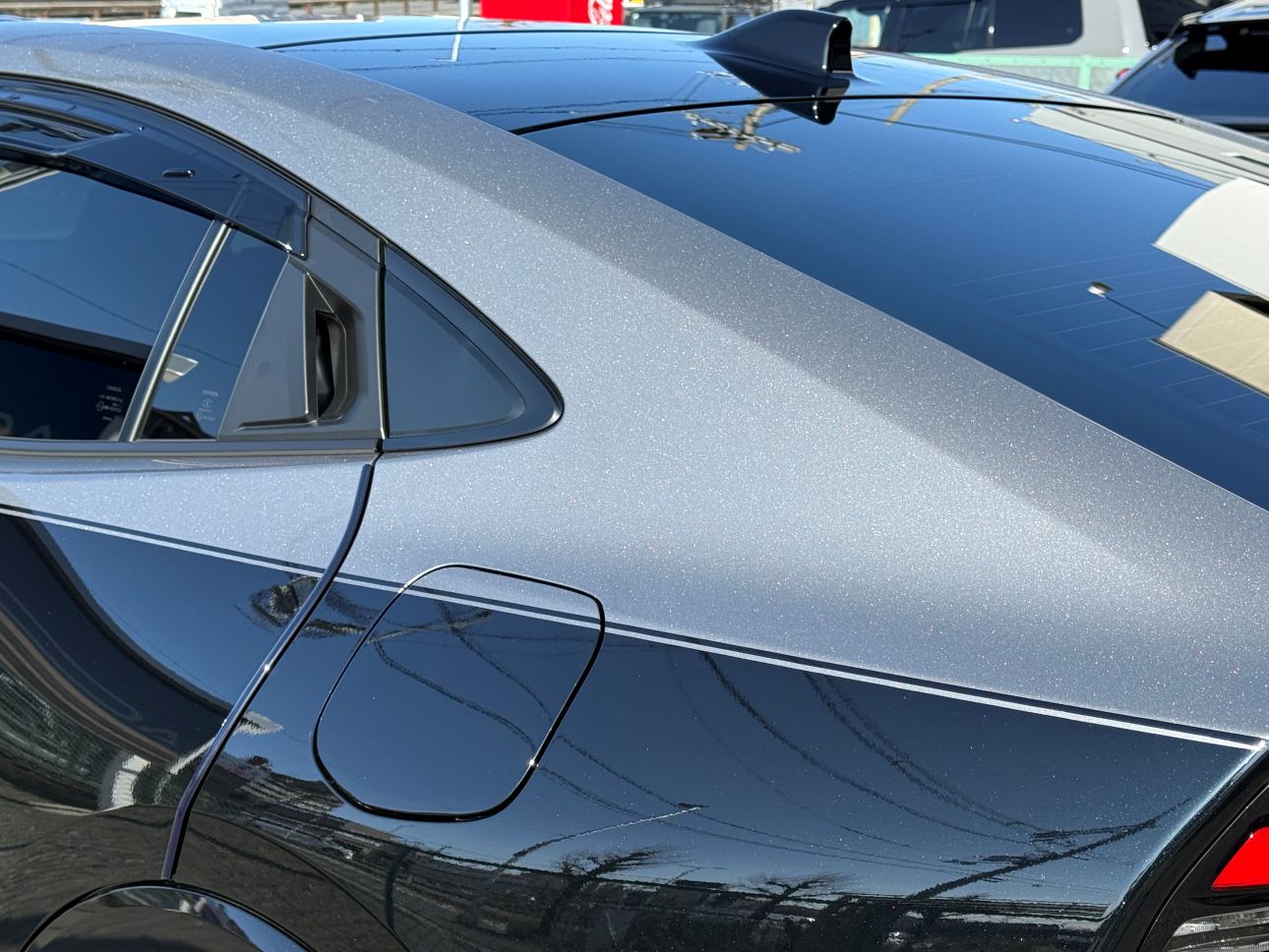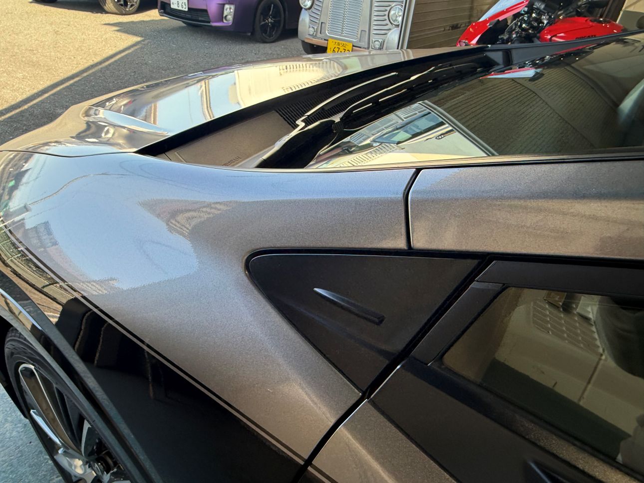 - フロントリップのカラーに合わせて、グロスブラックボディにグロスガンメタリックで施工