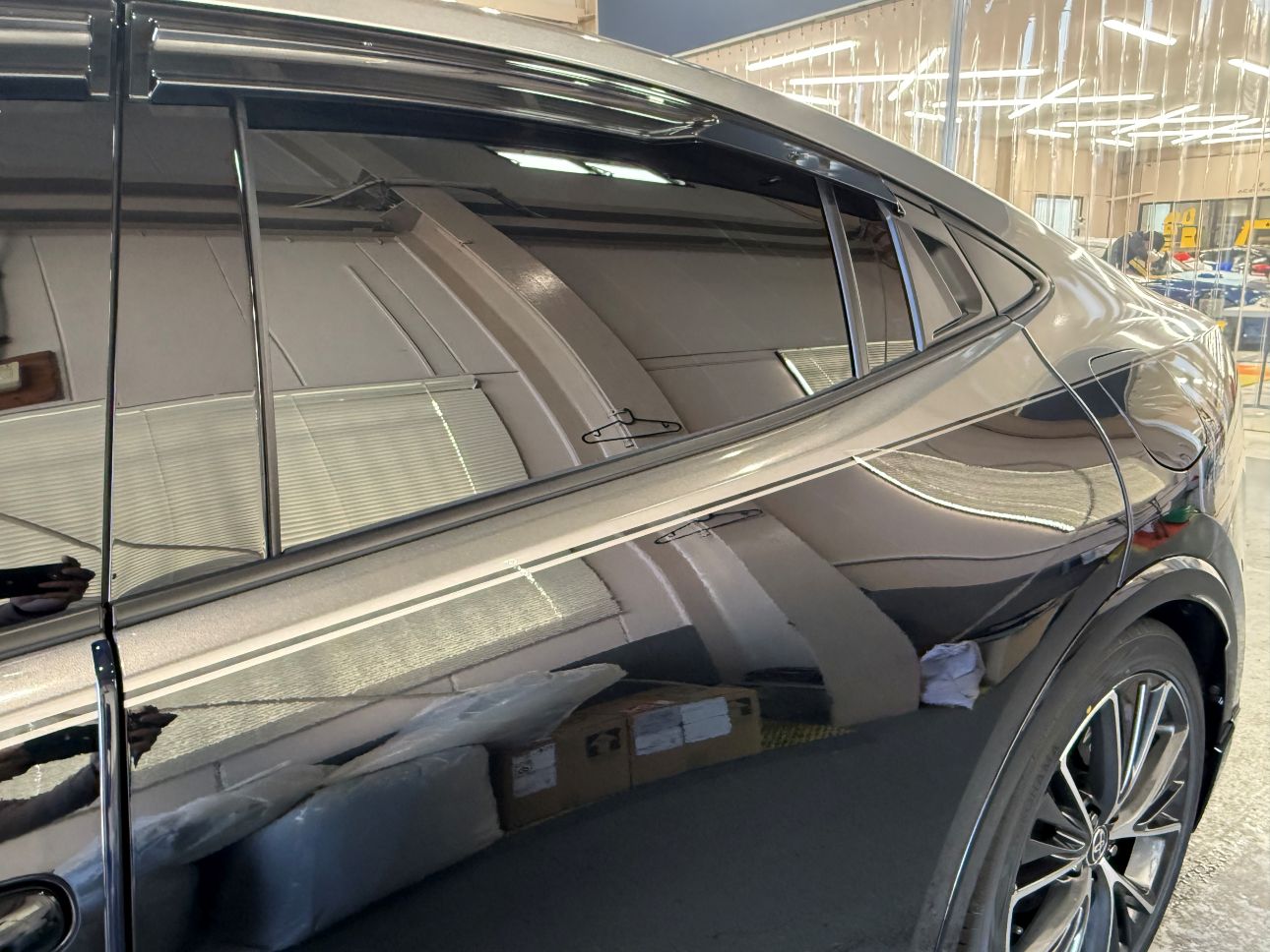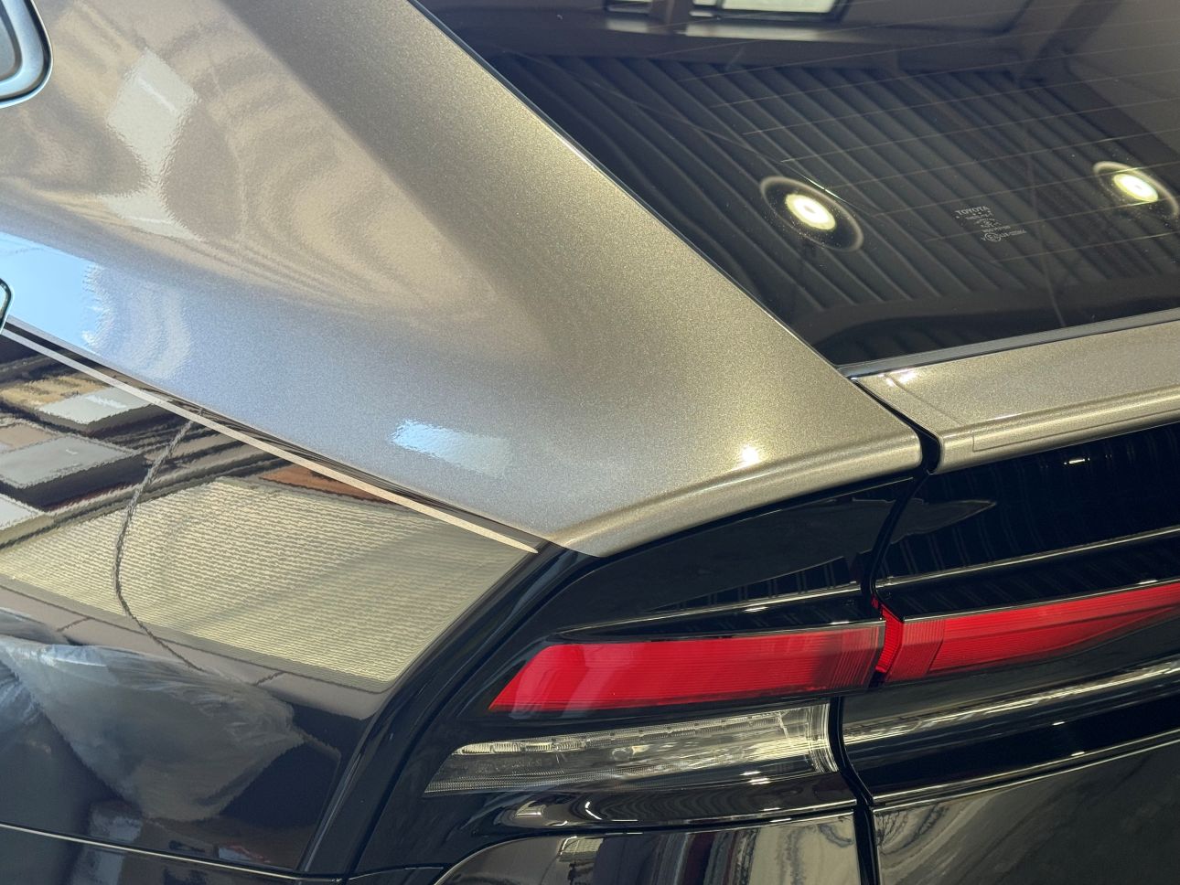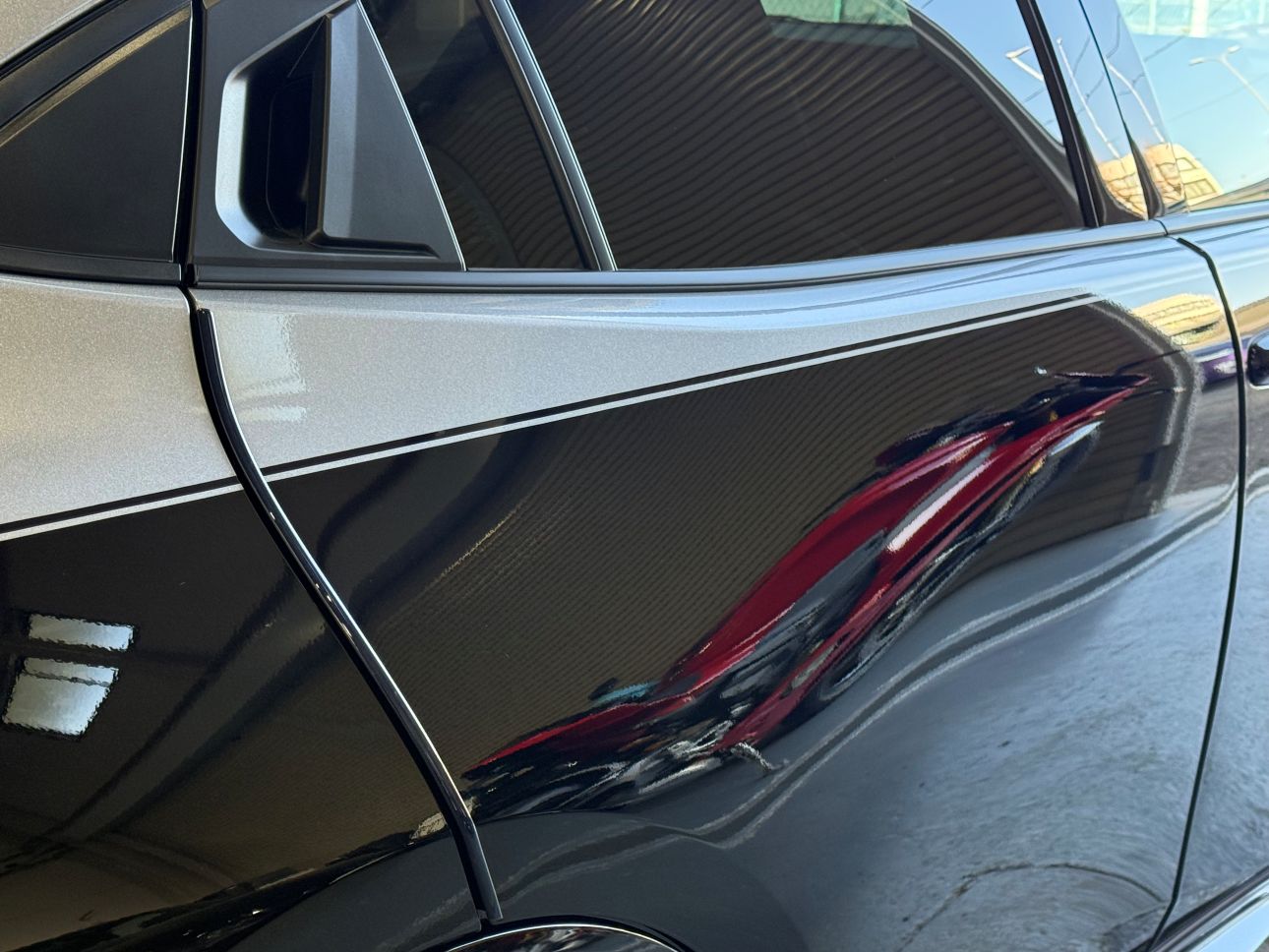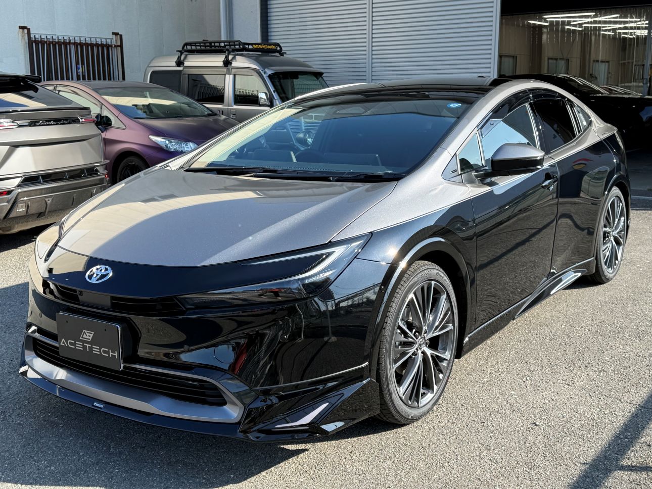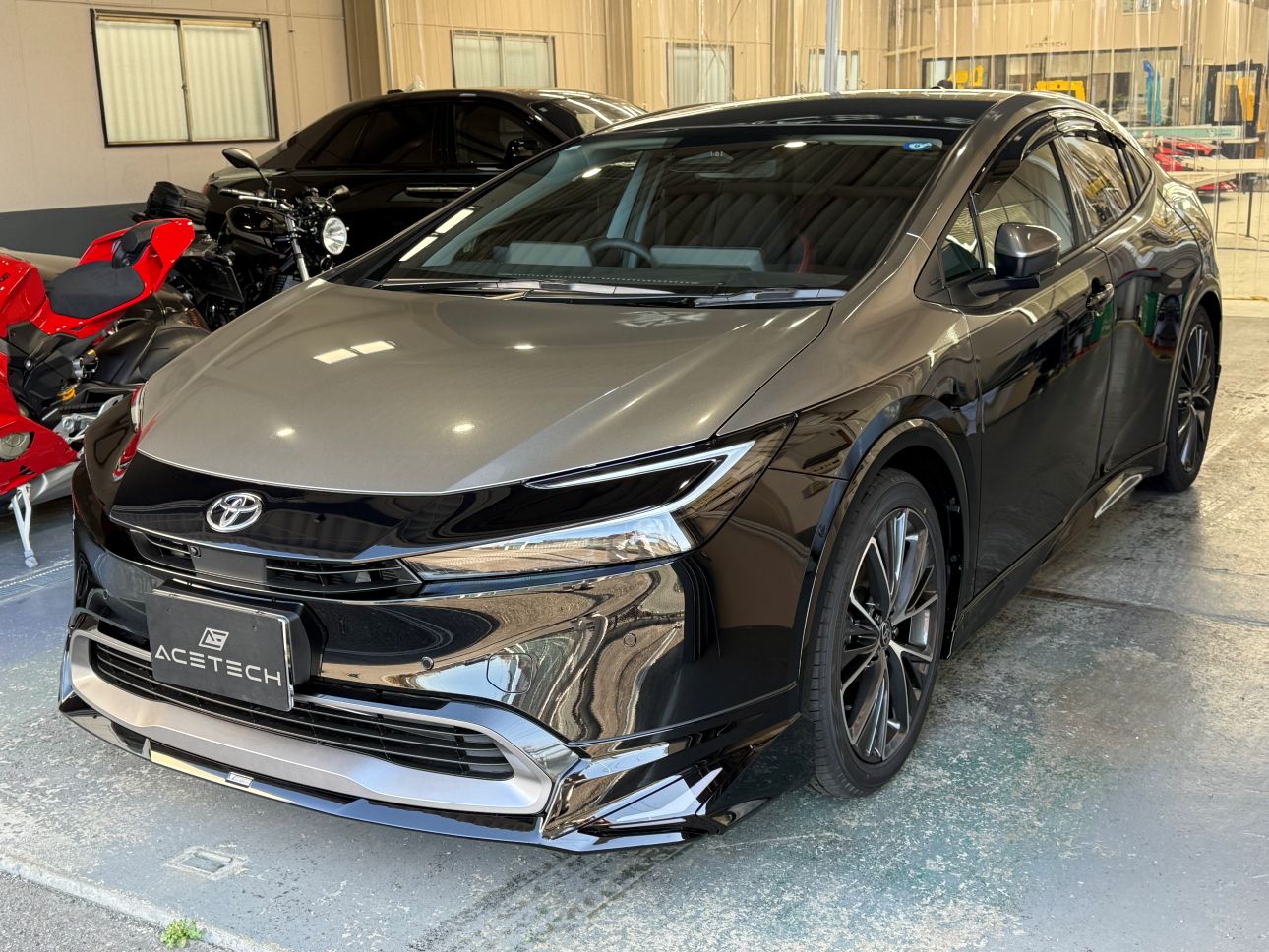 - フロントリップのカラーに合わせて、グロスブラックボディにグロスガンメタリックで施工