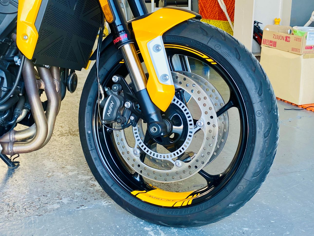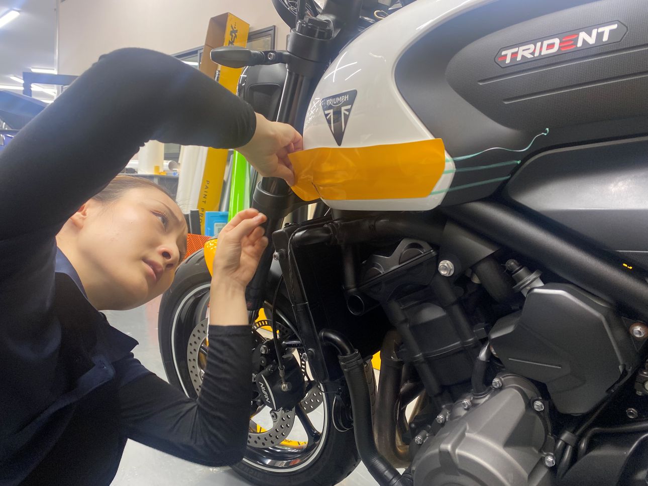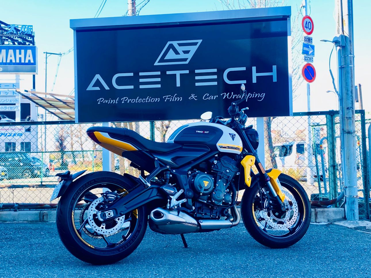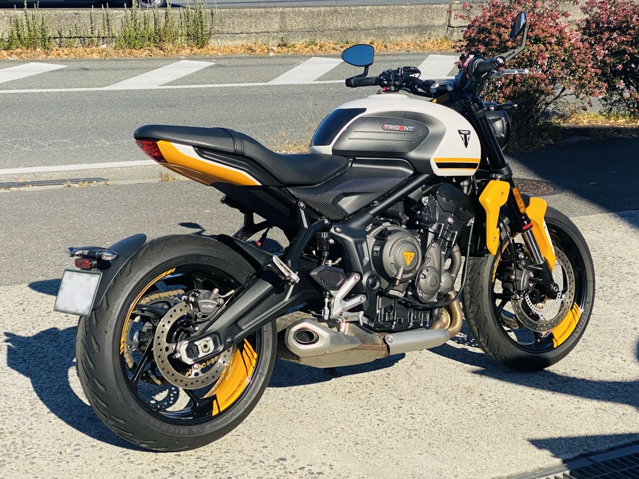 ホワイト単色でシックなトライデント660でしたが、イエローを追加する事で一気にスポーティなトライデントに変貌させる事ができました。