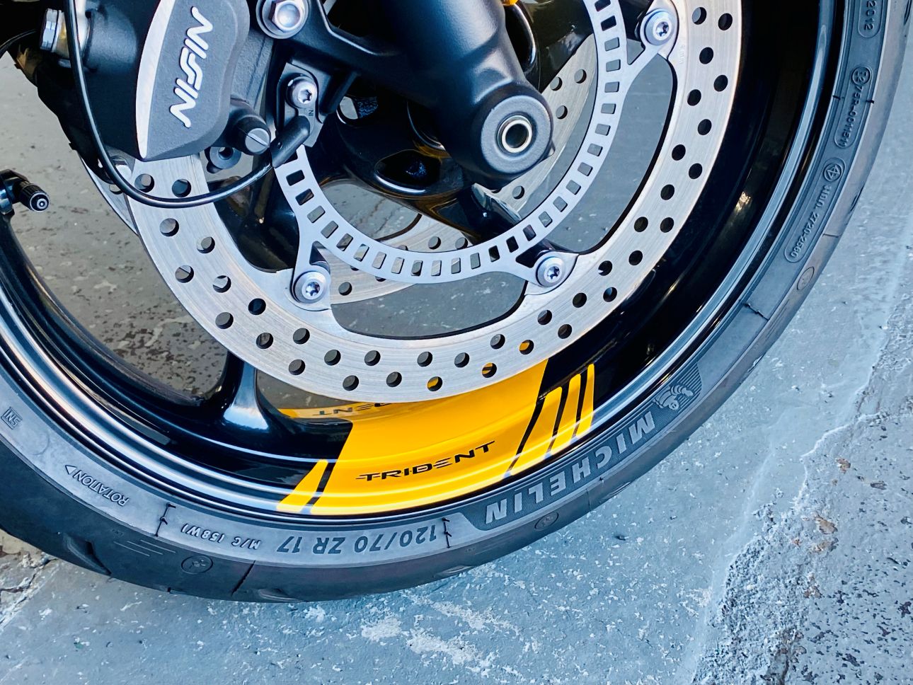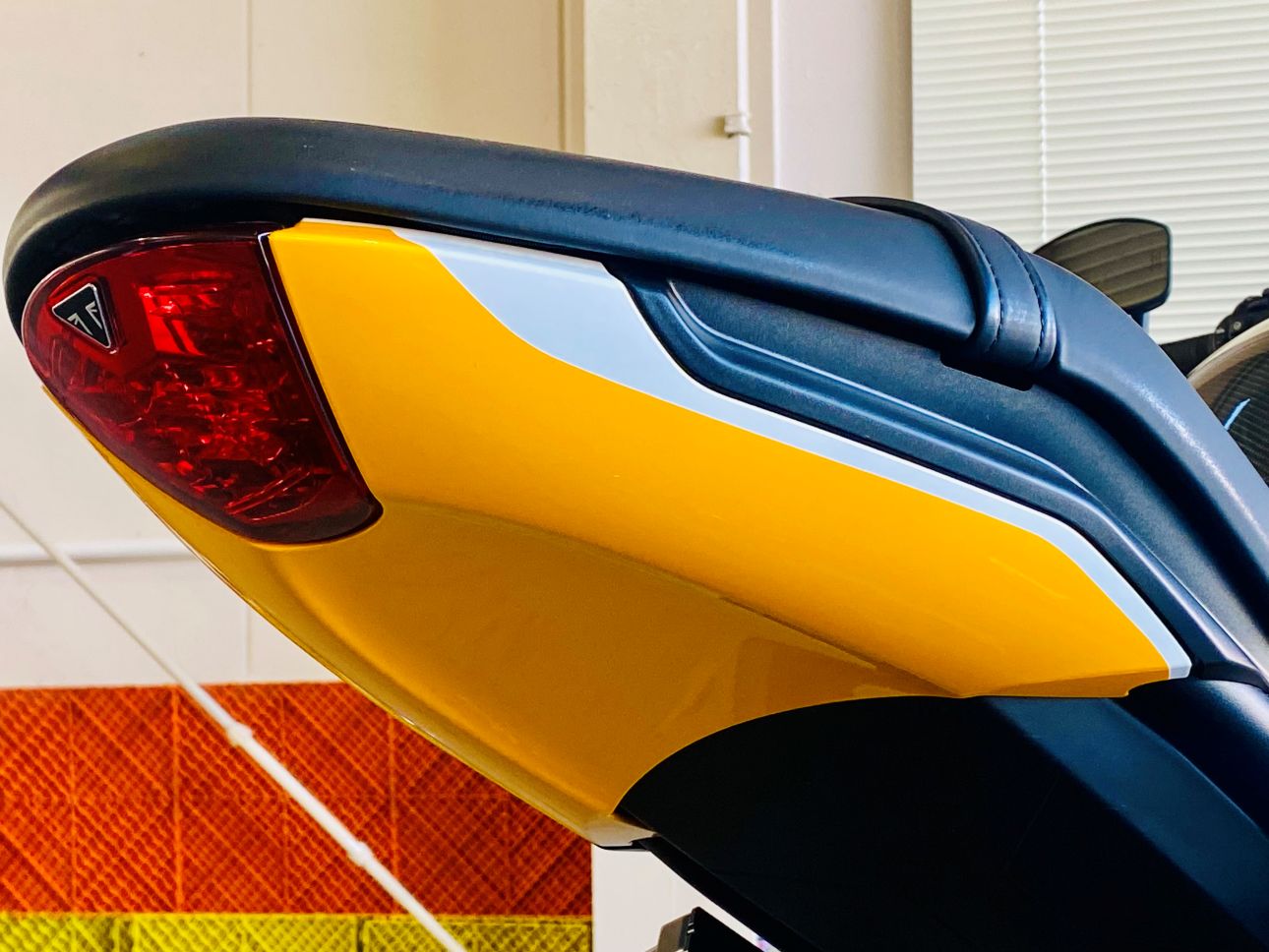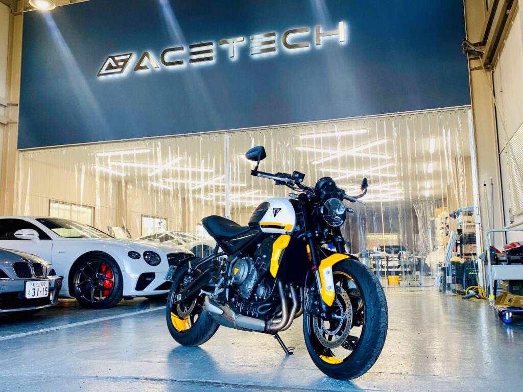 ホワイト単色でシックなトライデント660でしたが、イエローを追加する事で一気にスポーティなトライデントに変貌させる事ができました。