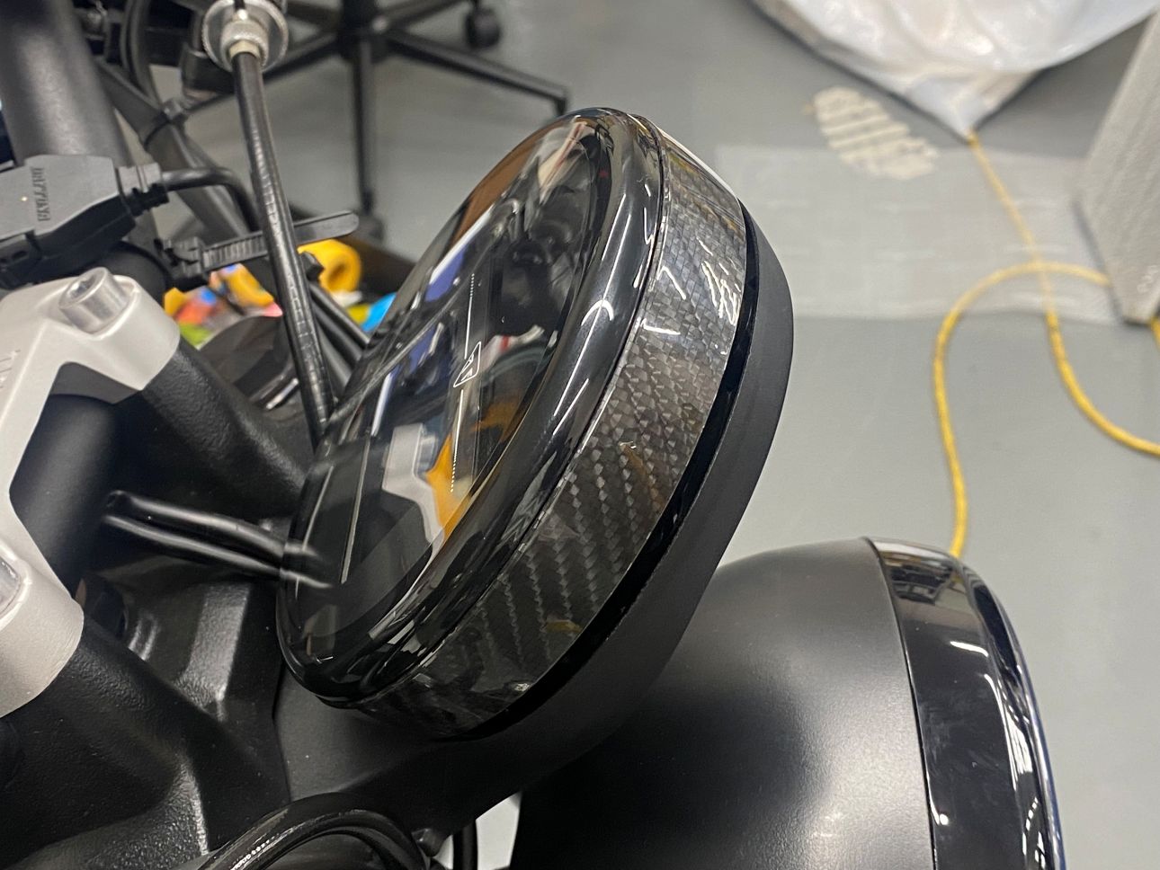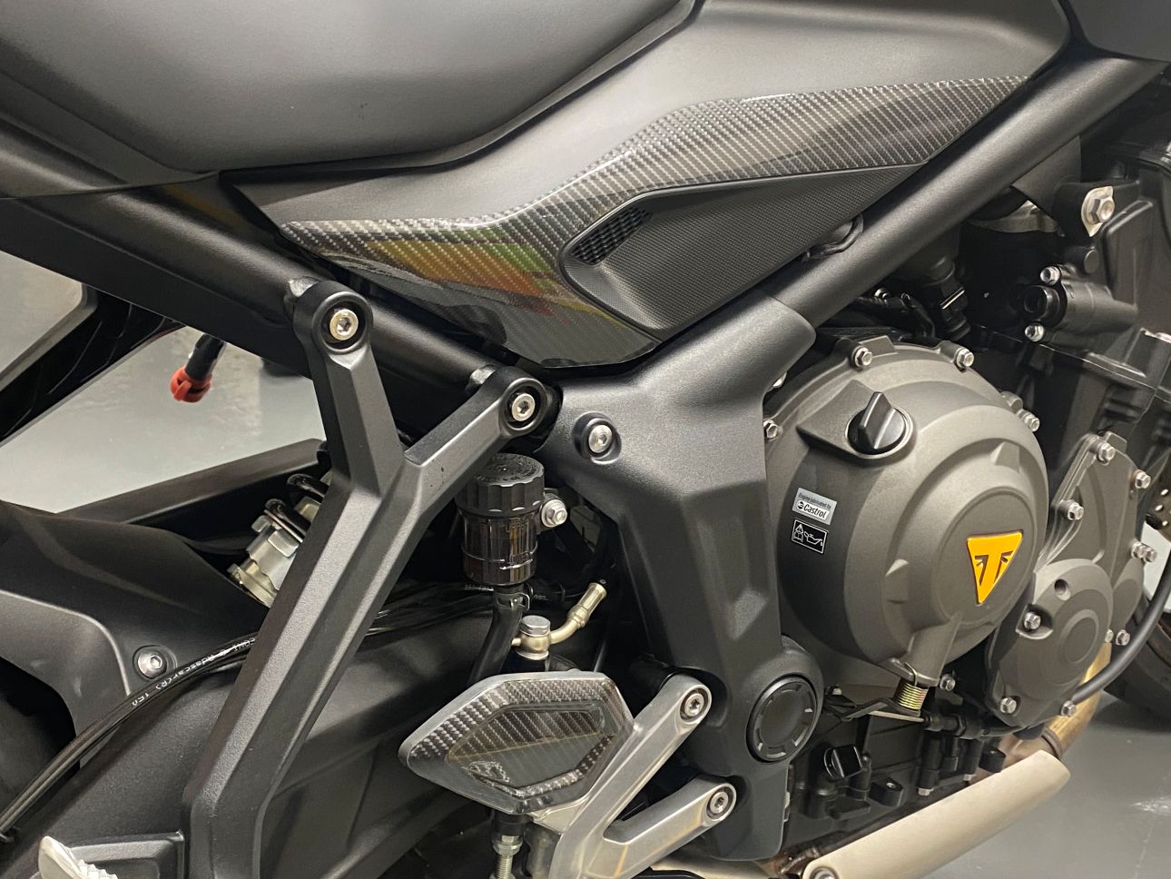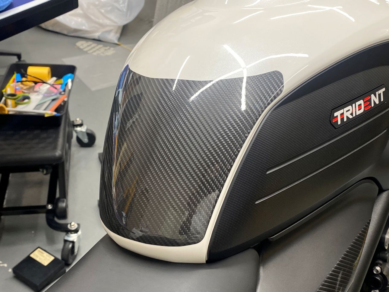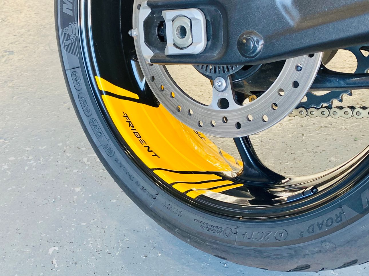 ホワイト単色でシックなトライデント660でしたが、イエローを追加する事で一気にスポーティなトライデントに変貌させる事ができました。